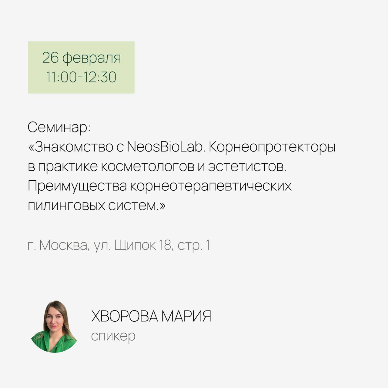 Спикер: Хворова Мария – врач-дерматовенеролог РНЦХ им. Б.В. Петровского НКЦ 3, косметолог, дерматоонколог, сертифицированный тренер NeosBioLab.